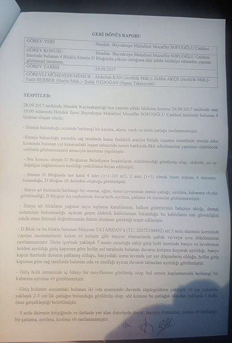 Valiliğimiz (İl Afet ve Acil Durum Müdürlüğü) şifai olarak yapılan başvuru üzerine Hendek İlçemiz Bayraktepe Mahallesi, Muzaffer Sofuoğlu Caddesi üzerinde bulunan 4 Bloklu sitede teknik ekip tarafından yapılan gözlemsel etüde istinaden tanzim edilen ‘’Görev Dönüşü Raporu’’ paylaşıldı.