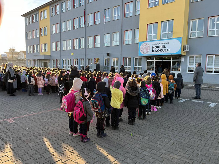 Hendek Noksel İlköğretim Okulunda da bayrak töreni öncesinde Pençe Kilit bölgesinde teröristlerce düzenlenen taciz ve sızma girişimi neticesinde şehit olan 9 askerimiz başta olmak üzere tüm şehitler için bir dakikalık saygı duruşunda bulunulurken ardından İstiklal Marşı okundu.