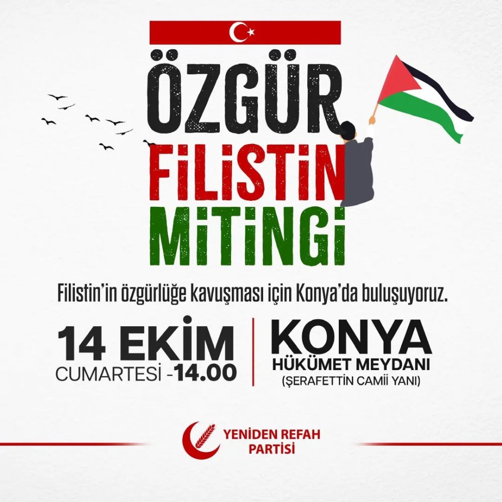 Bizler, Yeniden Refah Partisi olarak, Özgür Filistin için meydanlarda olacağız. Merkez Yürütme Kurulumuzun almış olduğu karar doğrultusunda; 14 Ekim 2023 Cumartesi günü saat 14:00’te, Konya ilimizin Hükümet Meydanı’nda, Özgür Filistin Mitingimizi gerçekleştireceğiz.