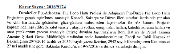 Demirciler Pig Adapazarı Pig Loop Hattı Projesi ve Adapazarı Pig Düzce Pig Loop hattı projesi ile ilgili, BOTAŞ hattının geçeceği noktalarda acele kamulaştırma yapılacak.