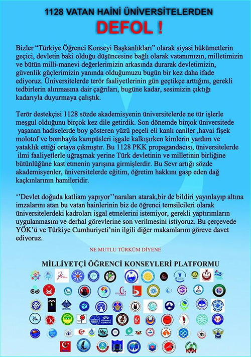 Devlet doğuda katliam yapıyor naraları atarak, bir de bildiri yayınlayıp altına imzalarını atan bu vatan hainlerinin biz de öğrenci temsilcileri olarak üniversitelerdeki kadroları işgal etmelerini istemiyor, gerekli yaptırımların uygulanmasını ve derhal görevlerine son verilmesini istiyor. Bu çerçevede YÖK'ü ve Türkiye Cumhuriyeti'nin ilgili diğer makamlarını göreve davet ediyoruz.