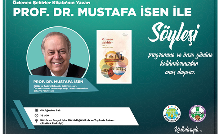 Hendek Belediyesi ve Hendek Ordulular Kültür, Eğitim ve Sosyal Dayanışma Derneği’nin işbirliğinde 9 Ağustos Salı günü saat 14.00’da Kültür ve Turizm Bakanlığı Eski Müsteşarı, önceki dönem Cumhurbaşkanlığı Genel Sekreteri ve Sakarya Milletvekili Prof. Dr. Mustafa İsen’in yeni kitabının imza günü ve söyleşi programı Atatürk Parkı içerisinde bulunan Kültür ve Sosyal İşler Müdürlüğü Nikah ve Toplantı Salonunda gerçekleşecek. İsen söyleşinin ardından, ‘Özlenen Şehirler’ isimli kitabını imzalayacak.