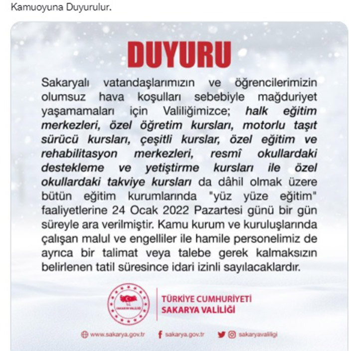 Valilik resmi sosyal medya hesabından yapılan açıklamaya göre; 24 Ocak Pazartesi günü faaliyet gösteren kurslarda eğitime ara verildi. Valilik’ten yapılan açıklama şöyle; “İlimizde etkisini sürdüren olumsuz hava koşulları sebebiyle, 24.01.2022 Pazartesi günü bütün eğitim kurumlarında yüz yüze eğitim faaliyetlerine 1 (Bir) gün süreyle ara verilmiştir.”
