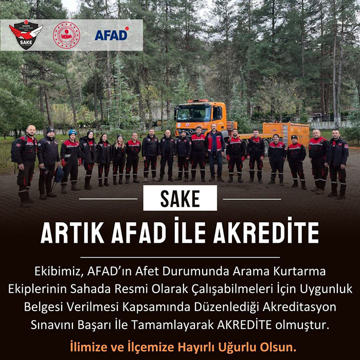 Konuyla ilgili bilgi veren Sakarya Arama Kurtarma Ekibi (SAKE) Başkanı Erdal Aydın, ekibimiz Afet Durumunda Arama Kurtarma Ekiplerinin Sahada Resmi Olarak Çalışabilmeleri için AFAD tarafından Uygunluk Belgesi verilmesi kapsamında düzenlene Akreditasyon Sınavını Başarıyla tamamlayarak Akredite olmuştur. Ülkemize, İlimize ve İlçemize hayırlı olsun ifadelerine yer verirken, SAKE Akredite Belgelerinin ilerleyen bir tarihte Cumhurbaşkanı Recep Tayyip Erdoğan’ın katılacağı bir törenle teslim edileceğini belirtti.