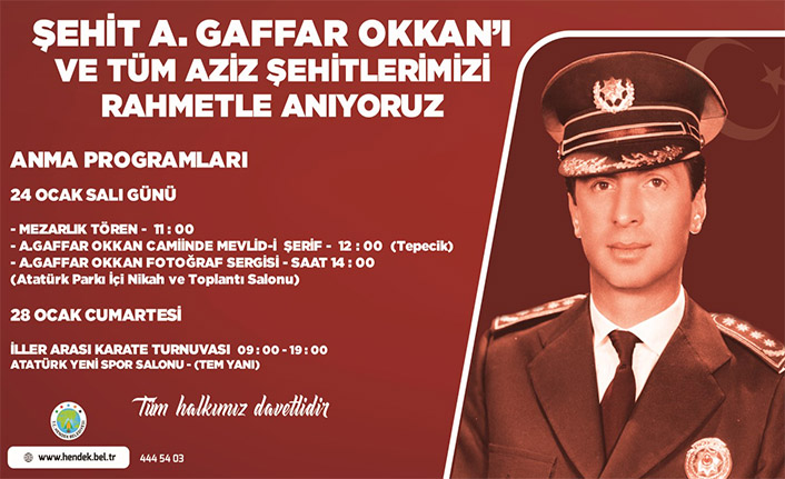 Diyarbakır Emniyet Müdürü iken 2001 yılında uğradığı hain saldırı sonucu 5 polis memuruyla birlikte şehit edilen Ali Gaffar Okkan, Hendek Kaymakamlığı öncülüğünde; Hendek Belediyesi ve Hendek İlçe Emniyet Müdürlüğü tarafından organize edilen program kapsamında İl- İlçe Protokolünün katılımıyla 24 Ocak Salı günü saat 11.00’da Hendek’te mezarı başında dualarla anılacak.