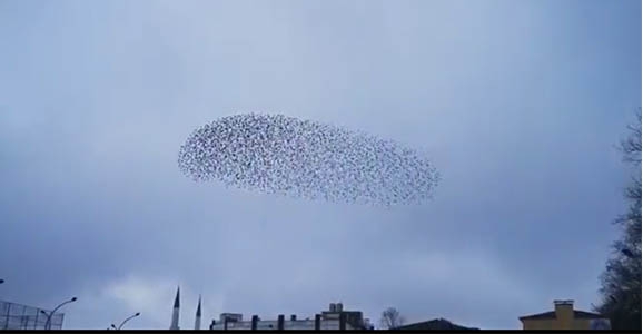 Her gün akşam namazı öncesi Gökyüzünde çeşitli geometrik şekiller çizerek dolaşan kuşlar, karanlığın düşmesi ile konakladıkları ilçe merkezinde ki ağaçlara iniyorlar.