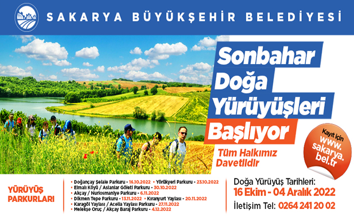 Sakarya Büyükşehir Belediyesi tarafından düzenlenen doğa yürüyüşlerinde Sonbahar dönemi yeniden başlıyor. Şehrin doğal güzelliklerinin keşfedildiği yürüyüşlerin ilki 16 Ekim Pazar günü Doğançay Şelalesi ile gerçekleştirilecek. 8 farklı parkurda düzenlenecek doğa yürüyüşlerinde sonbahar dönemi 4 Aralık Pazar günü Pamukova Melekşe Oruç-Akçay Parkuru ile sona erecek.