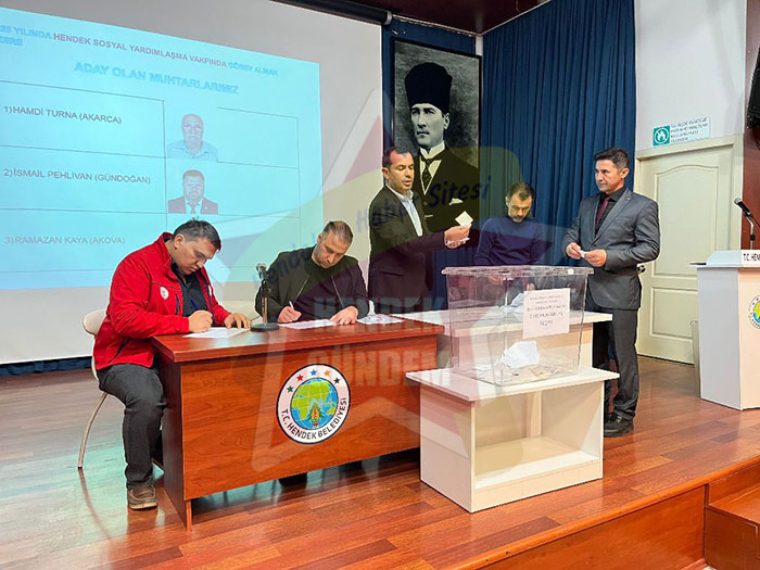 Akarca Mahalle Muhtarı Hamdi Turna, Gündoğan Mahalle Muhtarı İsmail Pehlivan ve Akova Mahalle Muhtarı Ramazan Kaya’nın Aday olduğu seçimde yapılan oylama sonucunda uzun yollardır görev alan Akarca Mahalle Muhtarı Hamdi Turna Sosyal Yardımlaşma ve Dayanışma Vakfı Mütevelli Heyetindeki görevine veda ederken, yapılan seçim sonucunda Hendek Sosyal Yardımlaşma ve Dayanışma Vakfında 2025 yılı içerisinde görev yapacak olan Muhtarlar Gündoğan Muhtarı İsmail Pehlivan ve Akova Muhtarı Ramazan Kaya oldu.