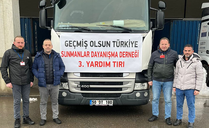 Sunmanlar Dayanışma Derneği, deprem bölgesindeki depremzede vatandaşlarımız için yaptığı çalışmalarına aralıksız olarak devam ediyor. Sunmanlar Derneği, 2 gün önce yine deprem bölgesine; yiyecek, giyecek, ısınma anlamında ihtiyaçlarını karşılayacak şekilde depremzedeler için 2 TIR yardım göndermişti.