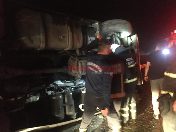 Edinilen bilgilere göre; TEM Otoyolu Hendek Kalayık mevkiinde İstanbul istikametinde seyreden C.Y idaresindeki 41 EU .... plakalı Tır, önünde seyir halinde olan F. A idaresindeki otomobile aşırı yağış nedeniyle kızaklama kayarak çarptı. Kazada her iki sürücü yaralandı.