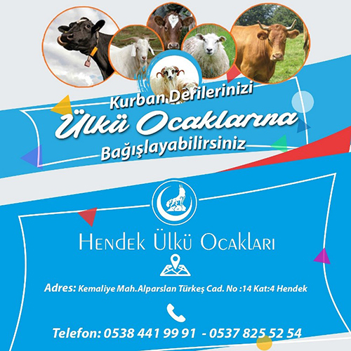 Ülkü OcaklarıHendek İlçe Başkanı Sıtkı Yaz “Bütün vatandaşlarımızın bu yılki kurban derilerini ocağımıza bağışlamalarını bekliyoruz. Derilerini bizlere ulaştırmak isteyen vatandaşlarımıza görevli arkadaşlarımız yardımcı olacaktır. Şimdiden katkı sunacak olan vatandaşlarımıza teşekkür ediyorum. Ocağa giden genç madde bağımlısı olmaz, hırsız olmaz, arsız olmaz, vatan haini olmaz, Alparslan, Fatih, Atatürk, Başbuğ olur. Adam olur ” dedi.
