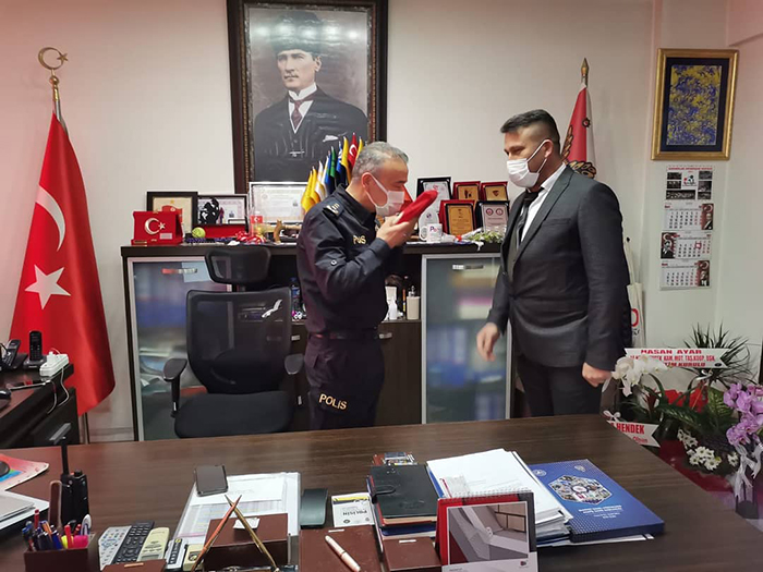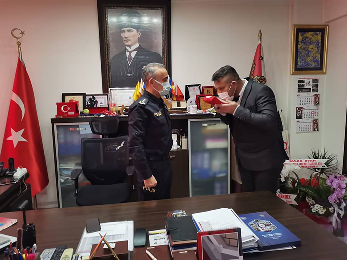 İlçe Emniyet Müdürlüğünü ziyaret eden Ülkü Ocakları Hendek İlçe Başkanı Sıtkı Yaz Hendek İlçe Emniyet Müdürü Şevket İlhan’a Türk Bayrağına sarılı Kuran-ı Kerim hediye ederek Polis haftasını kutladı.