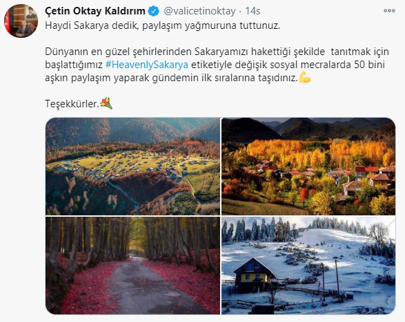 Dünyanın en güzel şehirlerinden Sakaryamızı hakettiği şekilde tanıtmak için başlattığımız #HeavenlySakarya etiketiyle değişik sosyal mecralarda 50 bini aşkın paylaşım yaparak gündemin ilk sıralarına taşıdınız dedi.