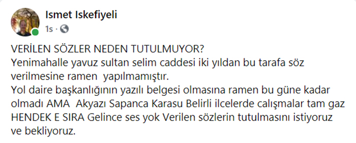 Kendisine ait sosyal medya hesabından konu ile ilgili başvuru dilekçesi ve cadde görselleri paylaşan İskefiyeli, “Yenimahalle Yavuz Sultan Selim Caddesi iki yıldan bu tarafa söz verilmesine rağmen yapılmamıştır. Yol Daire Başkanlığının yazılı belgesi olmasına rağmen bugüne kadar olmadı ama Akyazı, Sapanca, Karasu belirli İlçelerde çalışmalar tam gaz, Hendek’e sıra gelince ses yok. Verilen sözlerin tutulmasını istiyoruz ve bekliyoruz” ifadelerine yer verdi.