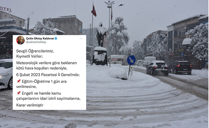 Kıymetli Veliler; Meteorolojik verilere göre beklenen kötü hava koşulları nedeniyle 6 Şubat 2023 Pazartesi İl Genelinde Eğitim-Öğretime 1 gün ara verilmesine, Engelli ve hamile kamu çalışanlarının idari izinli sayılmalarına karar verilmiştir” ifadelerine yer vererek Sakarya’da bulunan Okullarda Eğitime 1 gün ara verildiğini duyurdu.