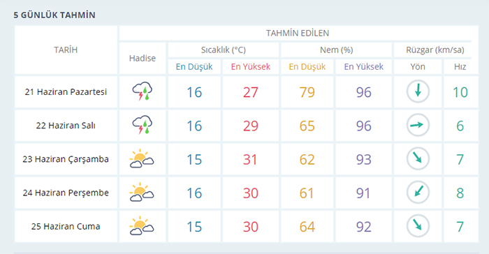 Meteoroloji Genel Müdürlüğü verilerine göre Hendek’in 5 günlük hava durumu.