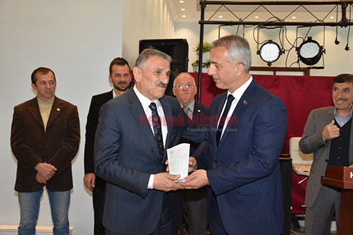 Hendek Belediye Başkanı Turgut Babaoğlu da, muhtarları tebrik ederek “ 31 Mart 2019 Yerel seçimlerinde Belediye Başkanlığımız halkımız tarafından tescillendi. Sizlerle ilk defa bir toplantıya katılıyorum. Benimle birlikte seçilen siz değerli muhtarlarımıza, geçmiş dönemde hizmet eden muhtarlarımıza ve en önemlisi görevi devraldığımız değerli Başkanımız İrfan Püsküllü ’ye ve onun vekili olarak aramızda bulunan Mahmut Nedim Alkan’a Hendek’imize yapmış oldukları güzel hizmetlerden ve katkılarından dolayı teşekkür ediyorum “ diyerek, Muhtarlar Derneği adına Başkan Vekili Mahmut Nedim Alkan’a teşekkür plaketi verdi.
