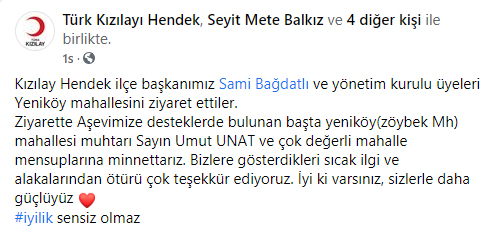 Kızılay Hendek Şubesi Koordinatörü Sami Bağdatlı, Aşevimize desteklerde bulunan başta Yeniköy Mahallesi Muhtarı Sayın Umut Unat ve çok değerli Mahalle mensuplarına minnettarız. Bizlere gösterdikleri sıcak ilgi ve alakalarından ötürü çok teşekkür ediyoruz. İyi ki varsınız, sizlerle daha güçlüyüz ifadelerine yer vererek hayırseverleri Aşevine destek olmaya davet etti.