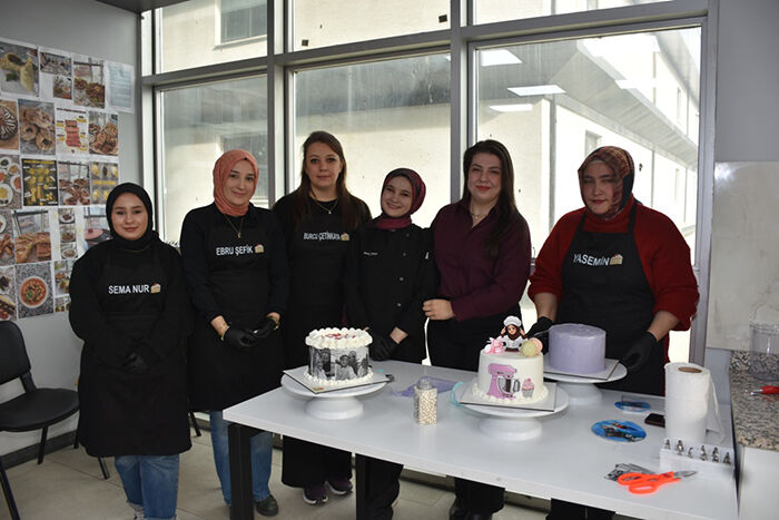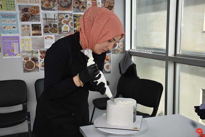 Hâlihazırda evlerinde butik pasta yaparak aile ekonomisine katkı sağlayan arkadaşlarımız da mevcut ifadelerine yer verirken, Aşçılık koordinatörü Zübeyda Öner, şu an 16 öğrencimiz var.