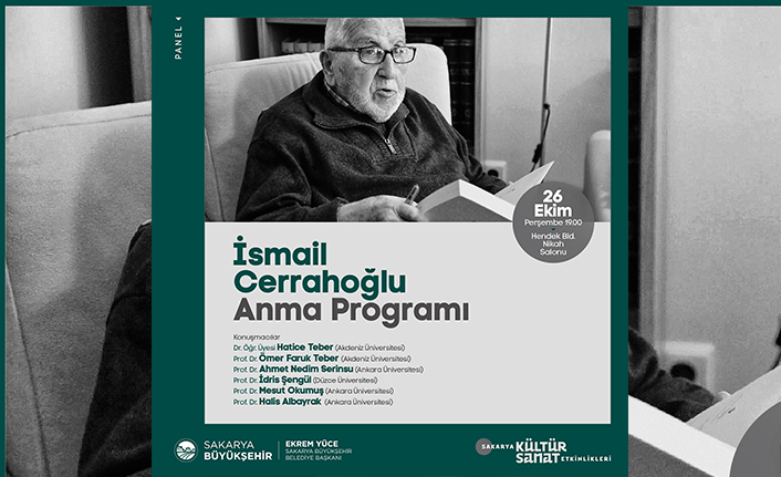 Sakarya Büyükşehir Belediyesi Ekim kültür sanat etkinlikleri İsmail Cerrahoğlu’nu anma programı ile devam edecek. 26 Ekim Perşembe günü Hendek Belediyesi Nikah Salonu’nda gerçekleştirilecek panele Prof. Dr. Ömer Faruk Teber, Prof. Dr. Ahmet Nedim Serinsu, Prof. Dr. İdris Şengül, Prof. Dr. Mesut Okumuş, Prof. Dr. Halis Albayrak ve Dr. Öğr. Üyesi Hatice Teber konuşmacı olarak katılacak.