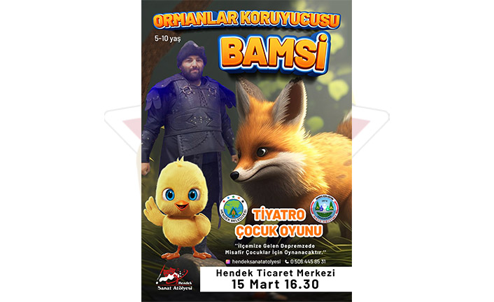 11 ili etkileyen Kahramanmaraş merkezli depremlerin ardından aileleriyle birlikte Hendek’te misafir edilen 5 - 10 yaş aralığındaki depremzede çocuklar adına Hendek Belediyesi, Hendek Halk Eğitim Merkezi ve Hendek Sanat Atölyesi işbirliğinde ücretsiz tiyatro etkinliği düzenliyor. Çocukların yaşadıkları travmadan uzaklaşarak normal hayata yeniden adapte olmaları adına düzenlenen etkinlikte “Ormanlar Koruyucusu Bamsi” adlı tiyatro çocuk oyunu gösterimi yapılacak.