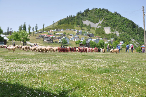Yaklaşık 7 kilometrelik yolu yüzlerce hayvanla kateden mahalle sakinleri, yaylaya geldiğinde meydanda toplanıp bir süre eğleniyor.