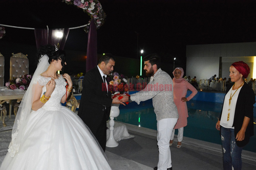 Yeni hizmete giren ve düğüne ev sahipliği yapan ENG Garden Düğün Organizasyon işletme müdürleri Kadir Yapıcı ve Zühal Eliyorgun, Burcu ve Birol çiftine Türk Bayrağı ve Kuran-ı kerim hediye etti.