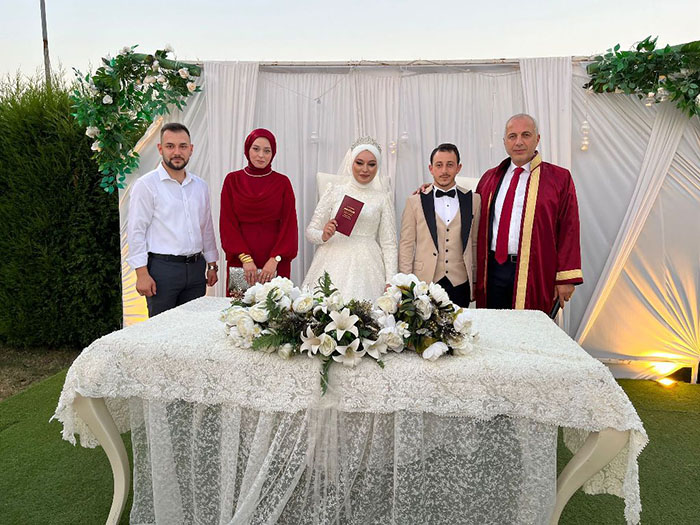 Genç çiftlerin nikahını Hendek Belediye Başkanı Turgut Babaoğlu kıyarken, nikah cüzdanını Ezginur’a teslim eden Babaoğlu genç çiftlere ömür boyu mutluluklar diledi.