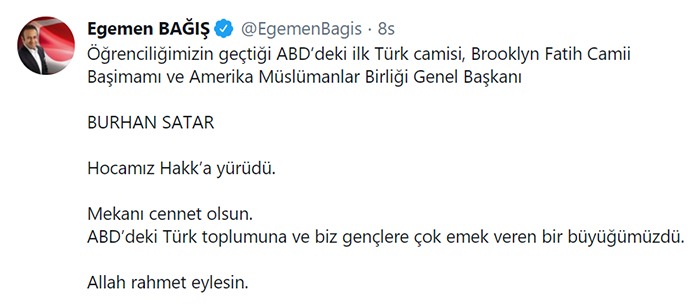 Bağış yaptığı paylaşımda, “Öğrenciliğimizin geçtiği ABD’deki ilk Türk camisi, Brooklyn Fatih Camii Başimamı ve Amerika Müslümanlar Birliği Genel Başkanı Burhan Satar Hocamız Hakk’a yürüdü. Mekânı cennet olsun. ABD’deki Türk toplumuna ve biz gençlere çok emek veren bir büyüğümüzdü. Allah rahmet eylesin” ifadelerine yer verdi.