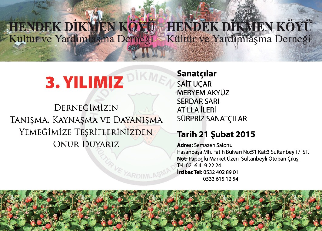 Hendek Dikmen Köyü Kültür ve Yardımlaşma Derneği Birlik ve Beraberlik Gecesi 21 Şubat 2015 Cumartesi Sultanbeyli’de yapılacak.