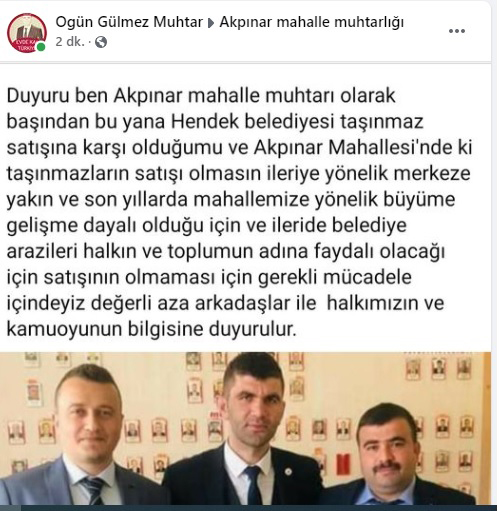 Duyuru, Ben Akpınar Mahalle Muhtarı Olarak başından buyana Hendek Belediyesi taşınmaz satışına karşı olduğumu ve Akpınar Mahallesi’ndeki taşınmazların satışı olmaması ileriye yönelik merkeze yakın ve son yıllarda mahallemize yönelik büyüme gelişme dayalı olduğu için ve ilerde belediye arazileri halkın ve toplumun adına faydalı olacağı için satışının olmaması için gerekli  mücadele içindeyiz değerli aza arkadaşlar ile halkımızın ve kamuoyunun bilgisine duyurulur ifadelerini kullandı.