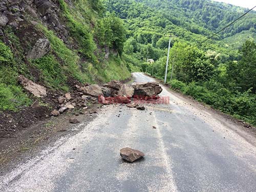 Üç gündür devam eden yağmur dolayısıyla toprağın yumuşamasından dolayı meydana gelen kaya düşmesi yolun tek araç geçecek şekilde kapanmasına yol açtı.