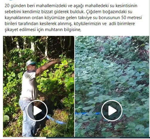 20 günden beri Mahallemizdeki ve aşağı mahalledeki su kesintisinin sebebini kendimiz bizzat giderek bulduk diyen Mahalle sakinleri, Çiğdem boğazındaki su kaynaklarının oradan köyümüze gelen takviye su borusunun 50 metresi birileri tarafından kesilerek alınmış. Kesilme hattın videolarını çekere adli birimlere şikayet edilmesi için muhtarımızın bilgisine sunduk ifadelerine yer verdiler.