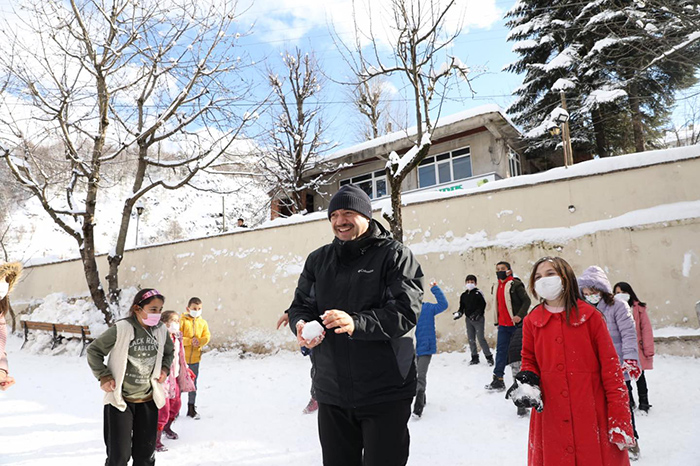 Öğrencilerle yakından ilgilenen Kaldırım öğrencilere bol bol kitap okumaları tavsiyesinde bulundu ve kar topu oynayarak coşkularına ortak oldu.