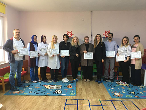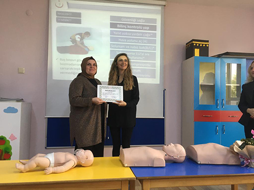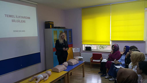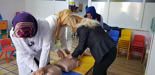 Uz. Hemşire Deniz De Asis’in teorik ve uygulamalı olarak eğitimci olarak görev aldığı çalışmada öncelikle okul öğretmenlerine acil durum ve temel yaşam desteği konularında ön test uygulayarak bilgi düzeyleri değerlendirildi. Daha sonra teorik olarak acil durumlarda ilkyardım, Acil Sağlık Hizmetlerini doğru ve yerinde kullanma, Temel Yaşam Desteği ,Yabancı cisim tıkanmaları konularında bilgilendirme yapıldı. Uygulamalı olarak devam eden eğitimde öğretmenlerin yaşam bulguları, bilinç kontrolü , Temel Yaşam Desteği (CPR) ve Kurtarıcı (Heimlich ) Manevraları gibi konularda bilgilenmesi hedeflenerek , uygulamalı ve drama yöntemiyle konunun yaşamsal önemine dikkat çekildi.