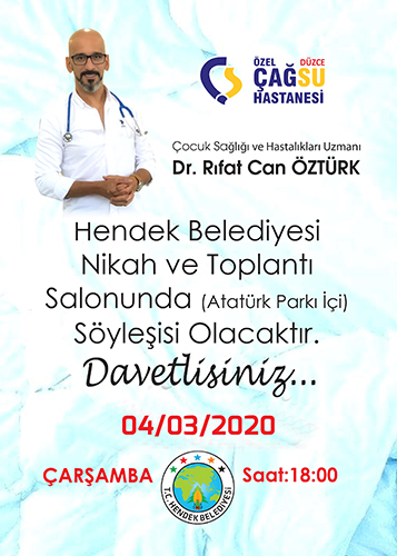 Hendek Belediyesi ve Düzce Özel Çağsu Hastanesi işbirliğinde Atatürk Parkı Nikah ve toplantı Salonunda, ‘Çocuk Sağlığı ve Hastalıkları’ konulu söyleşi düzenlenecek.