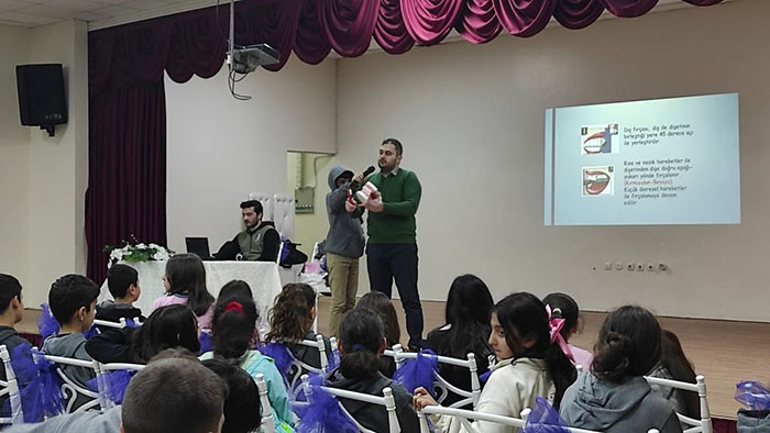 Hendek İlçe Sağlık Müdürlüğünde görevli Diş Hekimi Taha Göktuğ Kurnaz tarafından gerçekleşen eğitime Okul Müdürü Kadir Görme , okul öğretmenleri ve öğrenciler katıldılar. Diş Hekimi Göktuğ Taha Kurnaz özellikle erken yaşlarda diş ve ağız bakımının anlatılmasının gelecekte sağlıkla yaşam için önemli olduğu konusuna değinerek açıklamalarda bulundu: “İlkokul ve ortaokul yaş dönemleri çocuklar için karışık dişlenme dönemidir.