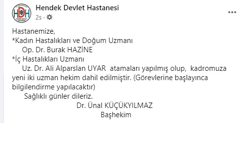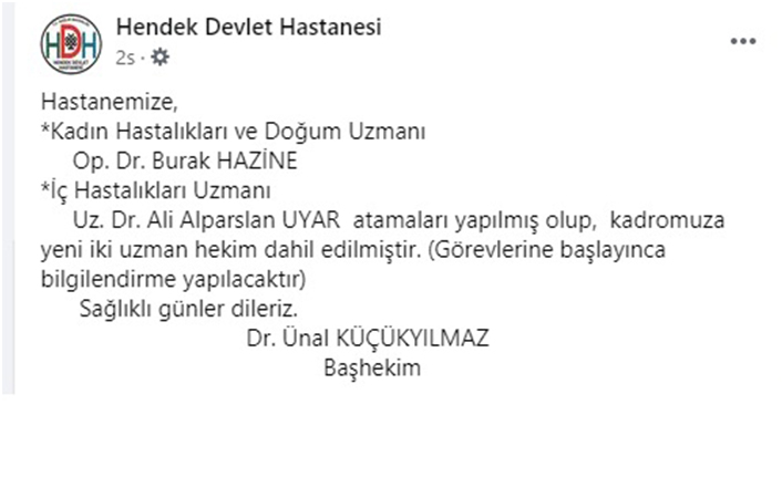 Hendek Devlet Hastanesi Baş Hekimi Dr. Ünal Küçükyılmaz Sosyal medyadan duyurdu.