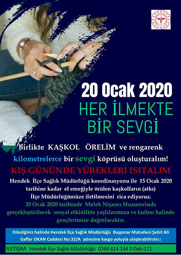 20 Ocak 2020 tarihinde gerçekleştirilmesi planlanan sanat ve müzik etkinliğinde Hendek Melek Nişancı Huzurevi sakinlerine dağıtılacak olan kışın sıcak tutacak ve yürekleri ısıtacak kaşkolları örerek paylaşmak üzere tüm vatandaşları davet ediyor.