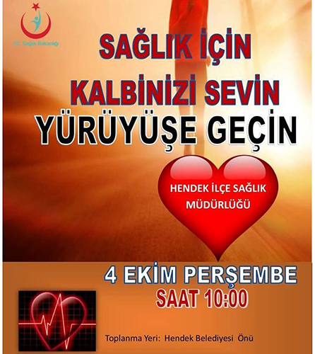 Sağlık için Kalbinizi Sevin, Yürüyüşe geçin sloganı ile program düzenleyen Hendek İlçe Sağlık Müdürlüğü herkesi yürüyüşe davet ediyor.