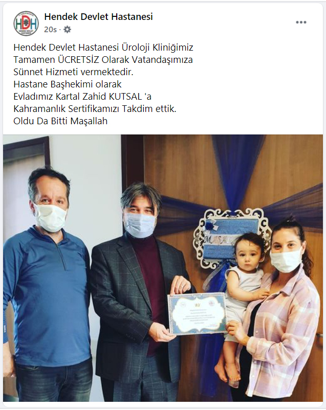 Konuyla ilgili olarak Hendek Devlet Hastanesi sosyal medya hesabından yapılan paylaşımda, “Hendek Devlet Hastanesi Üroloji Kliniğimiz Tamamen ÜCRETSİZ Olarak Vatandaşımıza Sünnet Hizmeti vermektedir. Hastane Başhekimi olarak Evladımız Kartal Zahid Kutsal’a Kahramanlık Sertifikamızı Takdim ettik. Oldu Da Bitti Maşallah” ifadelerine yer verilirken, Sünnet hizmetlerinin Devlet Hastanelerinde ücretsiz olarak yapıldığı bir kez daha hatırlatılmış oldu.