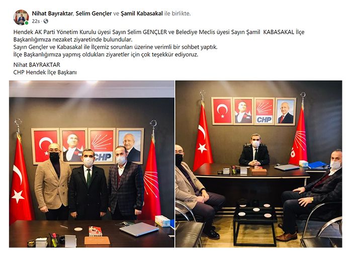 CHP Hendek İlçe Başkanı Nihat Bayraktar’ın sosyal medya hesabından yapılan paylaşımda, “Hendek Ak Parti Yönetim Kurulu üyesi Sayın Selim Gençler ve Belediye Meclis üyesi Sayın Şamil Kabasakal İlçe Başkanlığımıza nezaket ziyaretinde bulundular. Sayın Gençler ve Kabasakal ile İlçemiz sorunları üzerine verimli bir sohbet yaptık. İlçe Başkanlığımıza yapmış oldukları ziyaretler için çok teşekkür ediyoruz” ifadelerine yer verildi.
