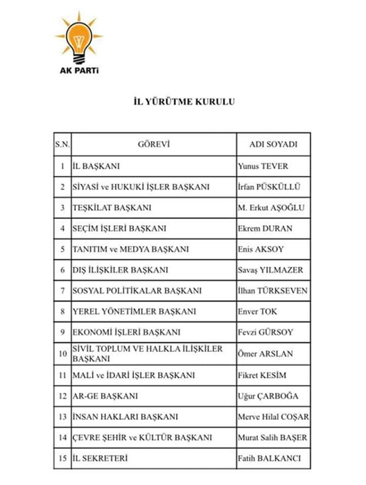 Konu hakkında sosyal medyadan paylaşım yapan Tever; “AK Parti Sakarya 7’nci Olağan Kongremiz sonrasında İl Yürütme Kurulumuz belirlenmiştir.