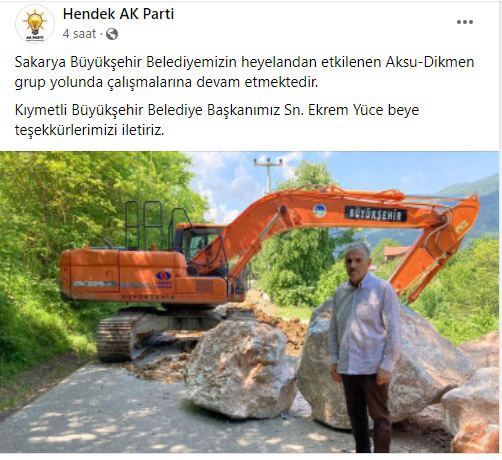 Sakarya Büyükşehir Belediyemizin heyelandan etkilenen Aksu-Dikmen grup yolunda çalışmalarına devam etmektedir ifadelerine yer veren Alkan, yapılan çalışmalar nedeniyle başta kıymetli Büyükşehir Belediye Başkanımız Sn. Ekrem Yüce Bey olmak üzere tüm Büyükşehir Belediyesi çalışanlarımıza bölge halkımız adına teşekkürlerimizi iletiriz ifadelerine yer verdi.