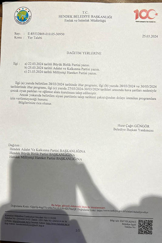 Bu gün, 25 Mart ta Hendek Belediyesi Cevap yazısını yollayarak 21/03 / 2014 Tarihinde MHP ve Ak Parti nin 27 Mart ve 30 Mart 2024 tarihleri Arasında Hava Muhalefeti nedeni ile ÇOCUK OYUN GURUPLARI Kurmak için talep ettiklerini, bu nedenle tarihlerinin çakışması sebebi ile Talebimizi RED Etti.