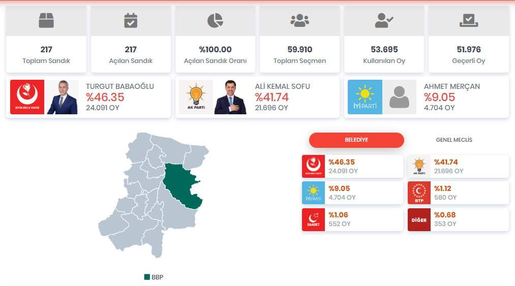 Kesin olmayan seçim sonuçlarına göre Hendek’te Büyük Birlik Partisi Adayı Turgut Babaoğlu sandıktan Belediye Başkanı olarak çıkarken, Belediye Meclis üyeliğinde ise Ak Parti birinci çıktı.
