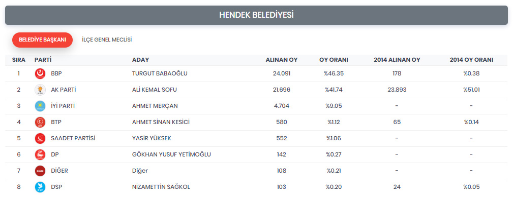 Hendek’te 59 Bin 910 seçmenden 53.695 seçmenin oy kullandığı ve 51.976 oyun geçerli sayıldığı seçim sonuçlarına göre Büyük Birlik Partisi Adayı Turgut Babaoğlu 24.091 (%46,35) oy alırken, Cumhur İttifakı Ak Parti Adayı Ali Kemal Sofu 21.696 (41,74) Millet İttifakı İyi Parti Adayı Ahmet Mercan 4.704 (%9.05) Bağımsız Türkiye Partisi Adayı Ahmet Sinan Kesici 580 (%1.12) Saadet Patisi Adayı Yasir Yüksek 552 (%1,06) Demokrat Parti Adayı Gökhan Yusuf Yetimoğlu 142 (%0,27) Diğer Adaylar 108 (%0,21) Demokratik Sol Parti Adayı Nizamettin Sağkol 103 (%0,20) oy oranına ulaştı.
