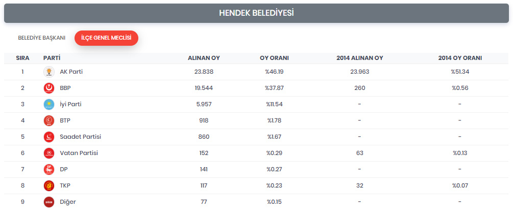 Hendek Belediye Meclis Üyeliği dağılımında ise Ak Parti yüzde 46,19 oranında oyla birinci olurken, Büyük Birlik Partisi yüzde 37,87, İyi Parti yüzde 11.54 oy aldı.