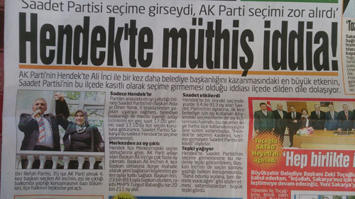 Saadet Partisi Hendek’te yerel yönetimler seçiminde aday çıkartmadığı için Partimize ve Halkımıza karşı bazı hile ve yalancılığı adet edinmiş organlar tarafından çıkartılan, haberlerde iki ile ikiyi toplayamamış ve gazetelerde hesaptan bi haber hesaplar yapılmış, seçimin kaderini Saadet Partisi belirledi diyerek manşet atılmış.