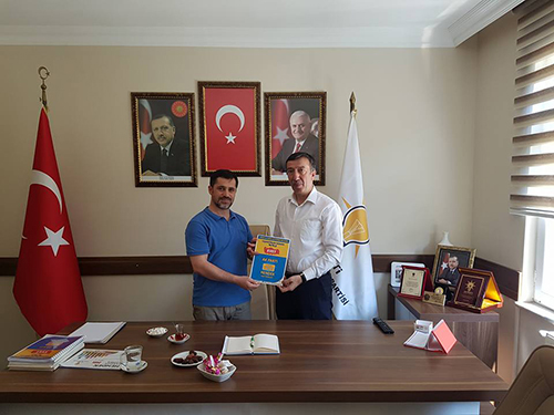 İlçe Başkanı Ali Kemal Sofu, Bakan Yardımcısı Hasan Ali Çelik’e 16 Nisan referandumu ile ilgili teşkilatın yaptığı çalışmaları anlatan faaliyet kitabı verdi.